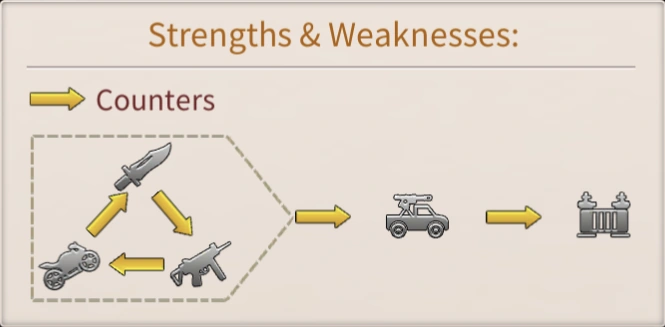 Veja que brutamontes têm vantagem sobre atiradores, atiradores têm vantagem sobre motos e motos tem vantagem sobre brutamontes. Essas 3 tropas possuem vantagem sobre carros e carros possuem vantagens sobre a muralha.